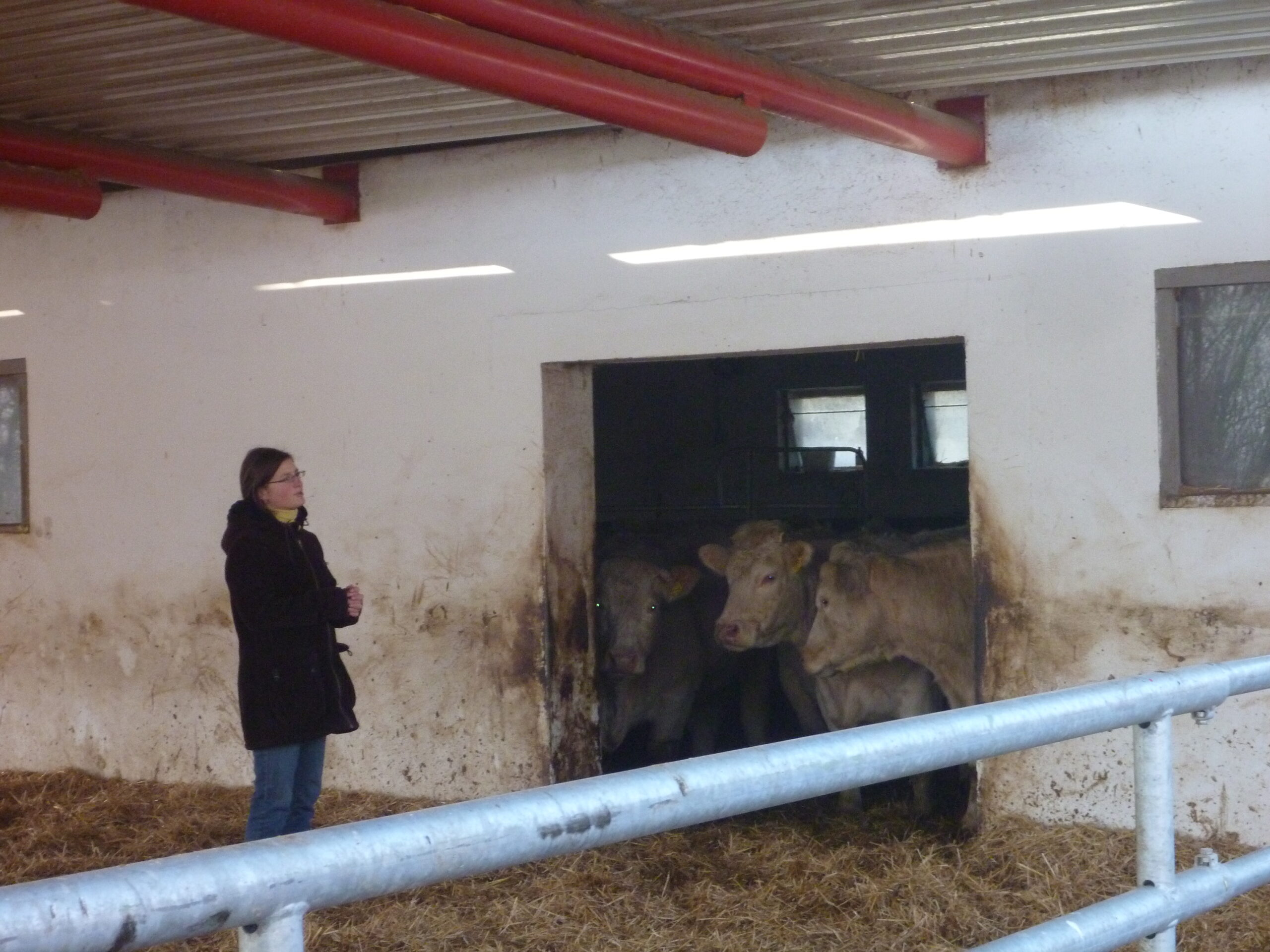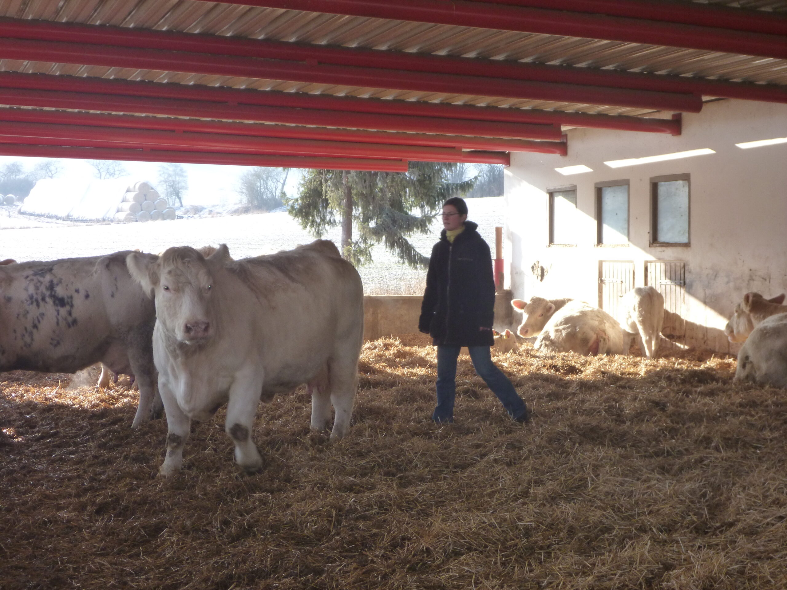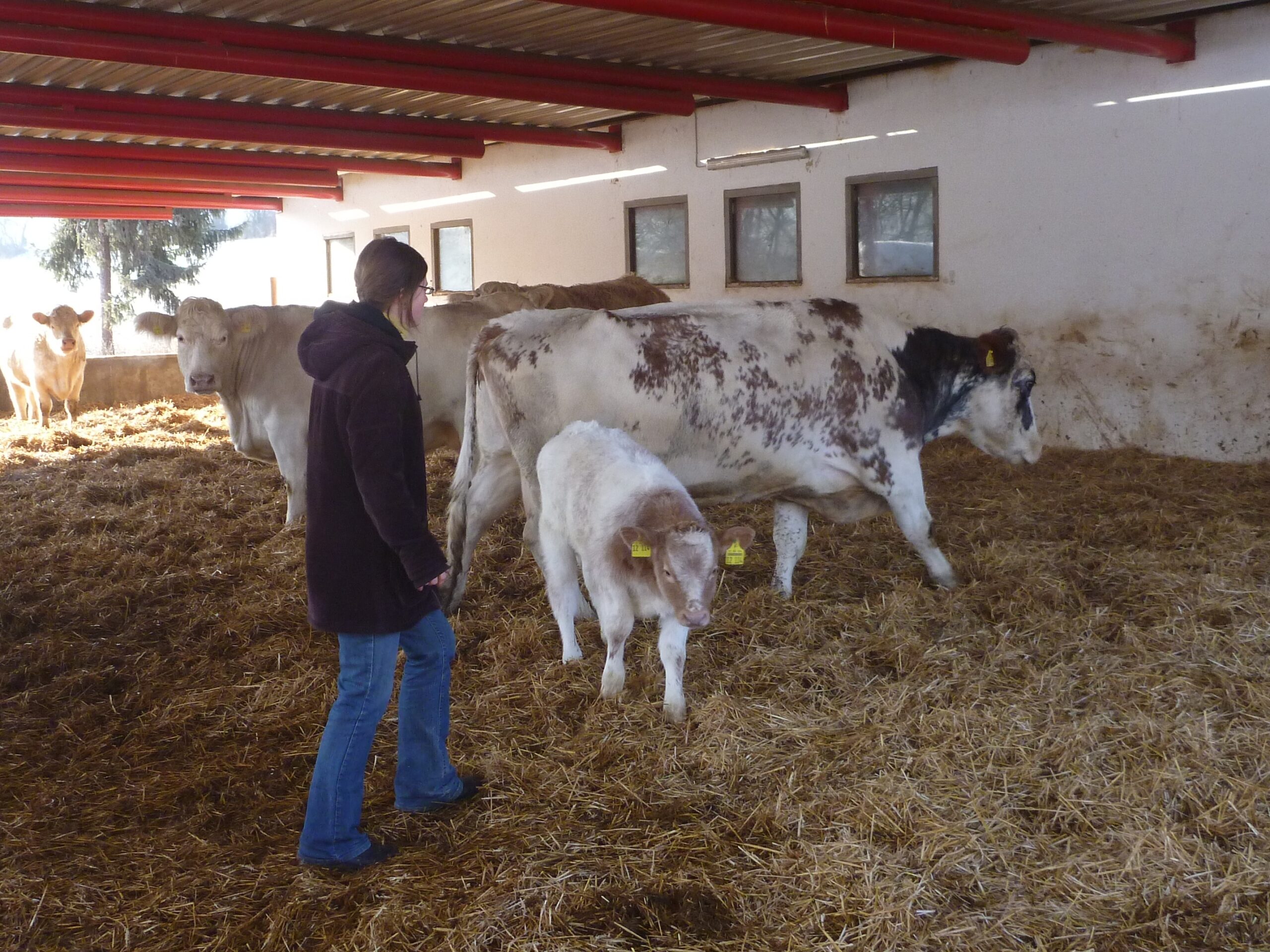 In zwei Stunden erarbeiteten sich etwa 40 Teilnehmende die Grundsätze der Methode, die Motivatoren der Kühe, mit denen auf der Alm hauptsächlich gearbeitet wird und das Gespür von Nähe und Distanz. Dann ging es zu Fuß auf einen Charolais-Zuchtbetrieb mit 25 Mutterkühen und deren 2 Monate jungen Kälbern im Laufstall. Dort zeigte ich einer kleineren Gruppe Zuschauer die Annäherung an mir unbekannte Rinder, das Prinzip von Impuls geben und Druck nachlassen bei gewünschter Reaktion der Kuh und eine kurze Sequenz des Bewegens der Herde.