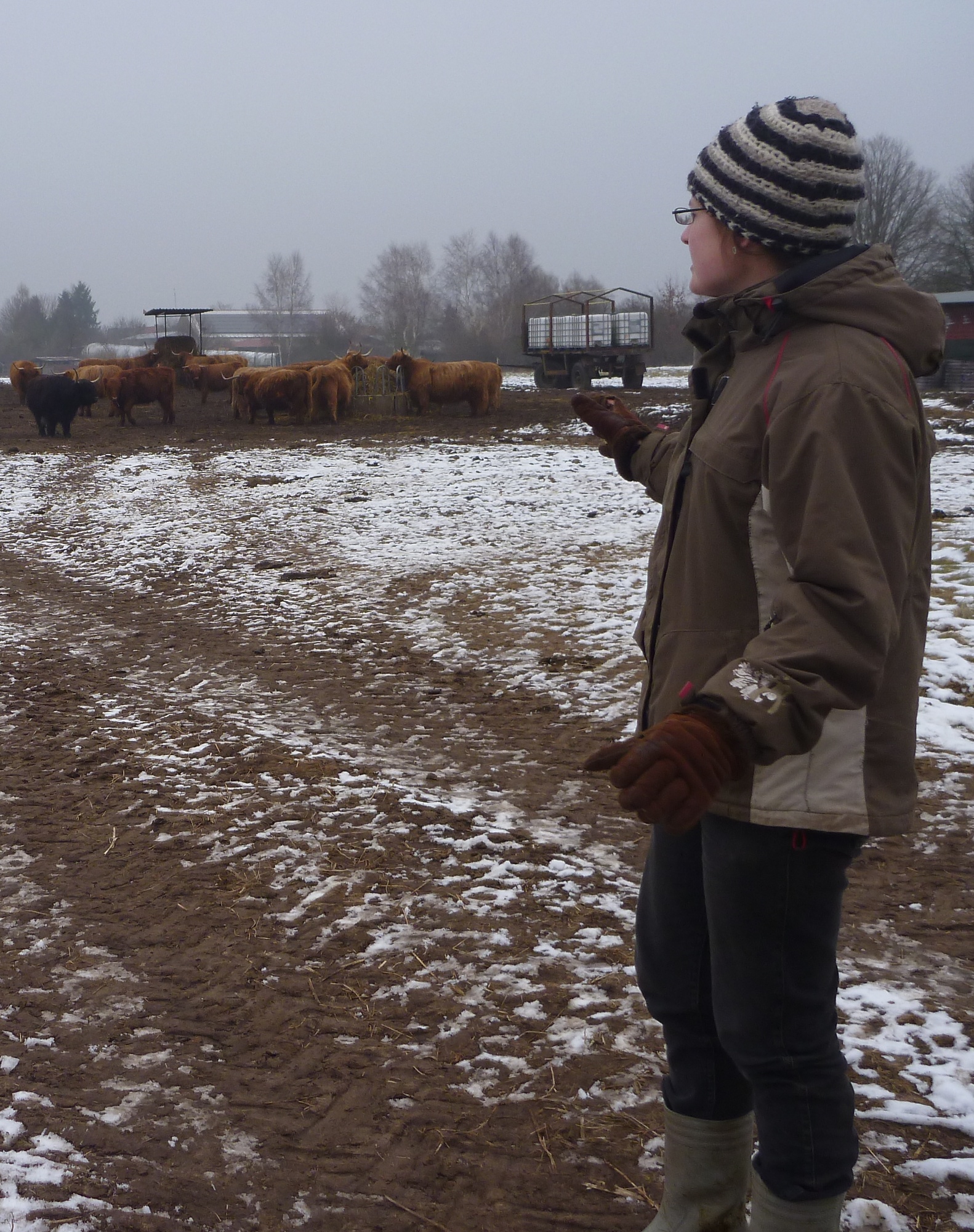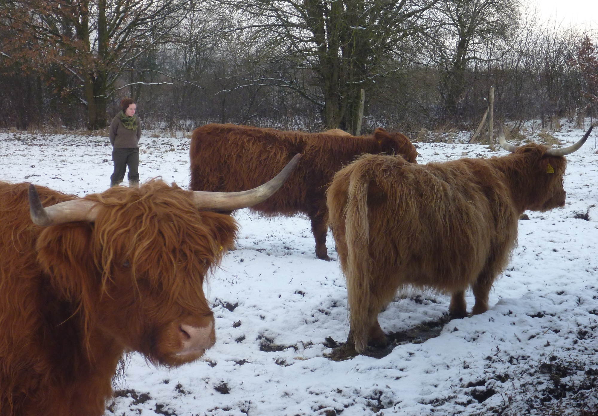 Schon vor einem Jahr traute ich mich in die Höhle des Löwen und trieb mit Johann vor dem Bauch, eingehüllt in Schaffell und Tragecover (denn es war seeehr kalt), die Auerochsen-Rückzüchtungen des Nationalparkvereins in den Fangstand. Ganz langsam, Mini-Schritt für Mini-Schritt, dann noch eine dünne Litze zum Absichern… Denn Wegrennen wäre mit Baby im Tragetuch nicht möglich gewesen. Aber es klappte.