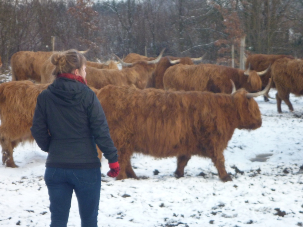 Ende November führte unser Weg nach Ostfriesland, um mit 16 Bundesfreiwilligen Stockmanship einzuüben. Die Theorie lief intuitiv und interaktiv, um die jungen Leute nicht in virtuelle Welten abschweifen zu lassen. In der Praxiseinheit gingen jeweils 8 mit Ani spazieren, die übten sich in Respekt und Mut und ein paar sensiblen Schritten. Denn da die Heckrinder sonst „mit Landrover und Trecker festgesetzt“ werden, um sie zu schießen, genügte eine schnelle Bewegung und sie waren am anderen Ende der Weide, welches sehr weit weg war. Sehr eindrücklich war der Bulle, der aussah als wäre er aus einer Spanischen Arena entkommen. Er war ungelogen einen halben Meter größer als die Kühe, aber nicht territorial veranlagt, sodass er immer mit der Herde mitzog. Trotzdem aufregend!